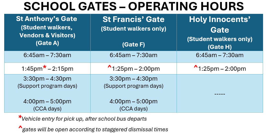This means that during these periods, vehicles are not allowed to enter through St Anthony’s Vehicles’ Gate (Gate A). These restrictions help manage student safety and traffic flow during key times, such as school’s dismissal.
