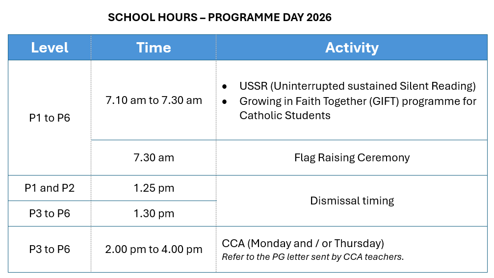 Monday to Friday (School operating days): 12:45 pm – 1:45 pm